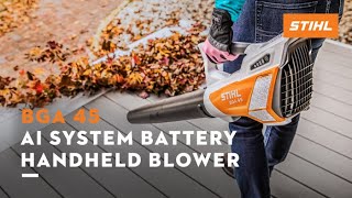 Part of the AI Series, the BGA 45 handheld blower delivers the power you need at an incredible value. It is exceptionally quiet and lightweight at 4.9 lbs., including integrated battery. On a single charge, the BGA 45 can clear more than 13 parking spaces (2,153 square ft.) with a blowing speed of 89 mph and an air volume of 247 cfm. If you own a small property and need a quick go-to blower for your driveway and walkways, the BGA 45 is the complete package. Usage claim tested and verified by an independent third-party test laboratory. Run time may vary based on battery type, charge level and capacity, model, operating style and conditions. Comes with integrated battery and charger.